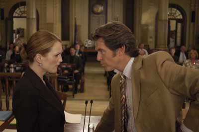 This is pretty much a generic romantic comedy where the two would-be love interests find themselves on opposite ends of competing interests. In many ways, Laws of Attraction suffers from following too closely on the heels of the Coen Brothers' Intolerable Cruelty, and also not being nearly as funny. Like many similar films, it's difficult to dislike, especially when the leads are so ingratiating in their performances, but the material lets them all down. While the actors, scenery and settings are all easy to look at and enjoy for the duration, at no time are we ever really engaged by the routine storyline. It's vacuous entertainment -- consumed easily and disposed of without much remembrance.
